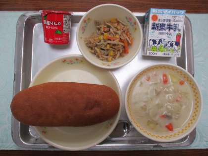 今日の給食は「クリームシチュー、ごぼうサラダ、フルーツゼリー」でした。ごぼうは土の中にまっすぐ1.5 m メートルほどのびて育ちます。そのため,折れたり傷がつかないように収穫するのが大変です。