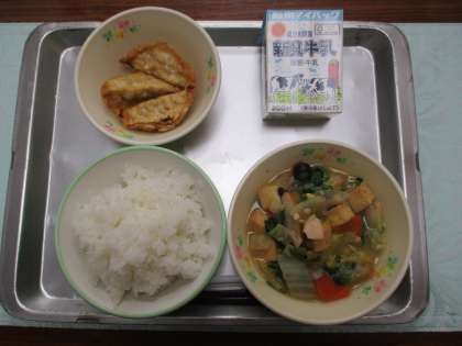 今日の給食は「石狩鍋、揚げ餃子」でした。北海道の石狩川では,鮭の漁が盛んに行われていました。みそ汁鮭を入れたものを食べたのが, 石狩鍋の始まりだそうです。