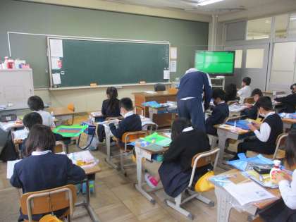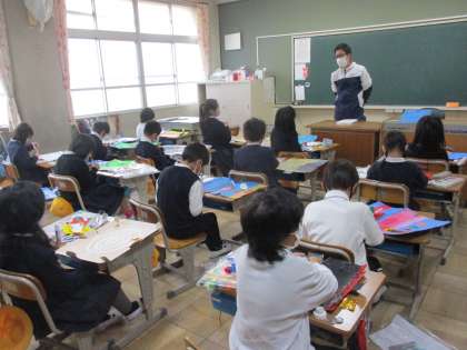 図工では「わくわくお話ゲーム」の制作を進めていました。下絵も塗り終わって、ストーリーに沿ったポイントを作っていました。すごろくのようなポイントの進め方に工夫を凝らした楽しいゲーム作りを熱心に取り組んでいました。