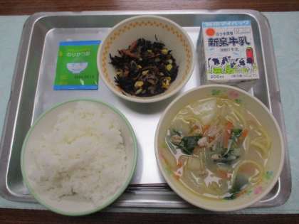 今日の給食は「豚骨ラーメン、ひじきの洋風煮、ふりかけ」でした。ラーメンは,全国各地でスープの味や麺の太さが違います。 今日は白いスープが特徴の,とんこつラーメン です。