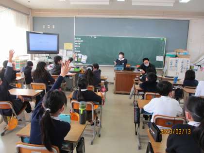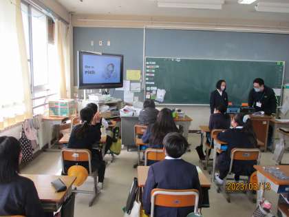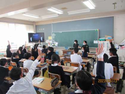 5年生 外国語 公開日 2023/03/13 更新日 2023/03/13 5年生 「私の夢の友だちを紹介しよう」をテーマに、パワーポイントを作りました。友だちになりたいと思ったキャラクターや歴史上の人物などを選び、スリーヒントにしてクイズ形式で発表しました。「He is cool.」や「He can fly.」など、これまでに習った表現を使うことができていました。適切なヒントを出すことができていたので、クイズに正解することも多かったです。英語を話すことや聞くことを楽しみながら行えていました。