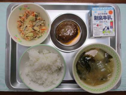 今日の給食は「卯の花、みそ汁、照り焼きハンバーグ」でした。うの花は「おから」ともいいます。大豆を無駄なく食べるための,日本人の工夫です。