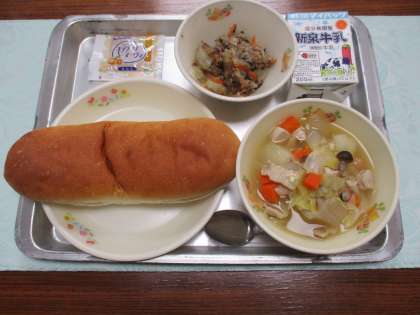 今日の給食は「スープ煮、サバのマヨネーズ焼き風、ミカンジャム」でした。さばのマヨネーズ風焼きは,さばの水煮を使っています。骨までやわらかくなっていますが,しっかり噛んで食べましょう。
