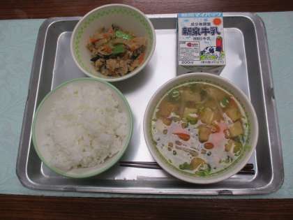 今日の給食は「五目汁、豚肉の生姜炒め」でした。五目汁の「五目」とは、5種類の材料という意味ではなく、たくさんの材料を使っているという意味です。今日は、6種類の材料を使っています。