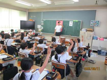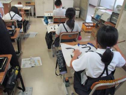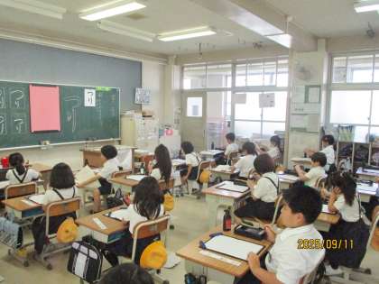 今日は「つり」を書きました。3年生から始まった書写(毛筆)ですが、ひらがなは初めて書きました。先生から「漢字とひらがなを見て、何か気づくことはないかな」と聞かれた子どもたちからは、「画数が少ない」「漢字よりなんか曲がるところが多い」などの意見が出ました。線のつながりをより意識して、練習に取り組んでいました。