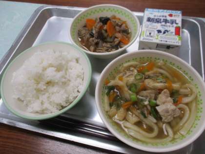 今日の給食は「ごはん・牛乳・なすと豚肉のいために・こぶうどん」です。こぶうどんは、とろろ昆布が入ったうどんです。江戸時代、昆布が北海道から大阪に北前船で運ばれ、堺の包丁技術と出会って「とろろ昆布」ができました。