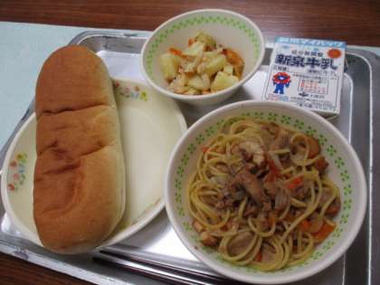 今日の給食は「コッペパン・牛乳・ツナとポテトのチーズ焼き・ソーススパゲティ」です。