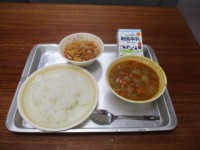 今日の給食のメニューは、ミニパン・あげパン、チリコンカン、うずらたまごいりやさい...