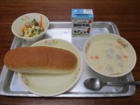 今日の給食のメニューは、コッペパン、ミートボールクリームシチュー、こまつなサラダ...