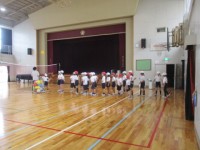 体育館でボールを使った授業です。バレーボールのネットを使って対戦していました。み...