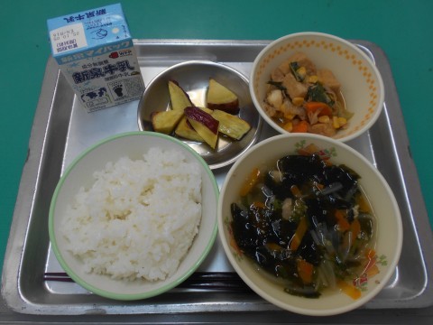 「ぎゅうにゅう,ごはん,わかめスープ,厚揚げの中華煮,焼き大学いも」でした。さつまいもは,江戸時代に薩摩(さつま:現在の鹿児島県)に伝えられたので「さつまいも」と呼ばれるようになりました。かぜをひきにくくしてくれるビタミンCや食物せんいがたくさん入っています。