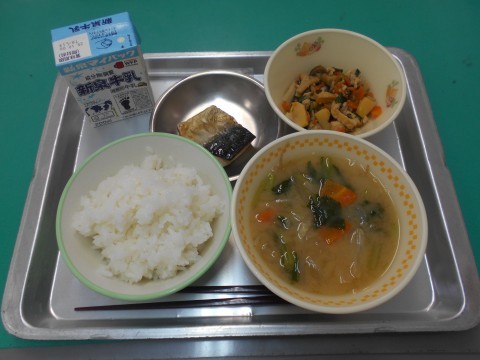 「ぎゅうにゅう,ごはん,まぜたら秋の風味ごはん,野菜たっぷりみそ汁,焼きさば」でした。「食欲の秋」といわれるように,秋にはおいしい食材がたくさんとれます。今日の給食に登場するきのこや栗,さばも秋の食材です。秋の食材を食べて,季節を楽しみましょう。