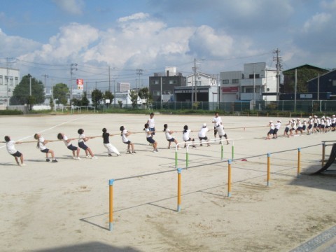 5年生と6年生が合同で綱引きの練習を行っていました。