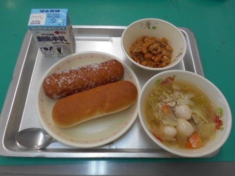 「ぎゅうにゅう,ミニパン・あげパン,チリコンカン,うずら卵入り野菜スープ」でした。チリコンカンはお肉と玉ねぎを炒めて、そこにトマトやいんげん豆などを加えて煮込み、チリパウダーでアクセントをつけて作ります。諸説ありますが、メキシコ料理が由来のアメリカの郷土料理です。