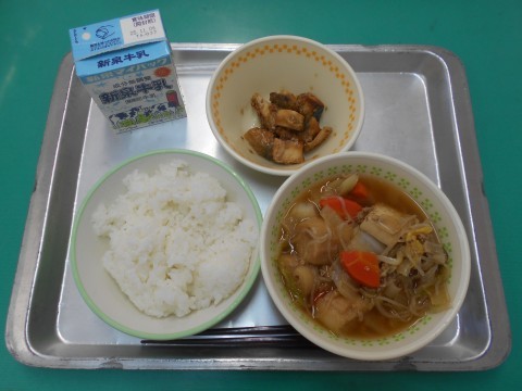 「ぎゅうにゅう,ごはん,すき焼き風煮,さばのごまみそやき」でした。すき焼き風煮に入っている白菜には、ビタミンCが多く含まれていて風邪を予防する働きがあります。鍋物や炒め物、漬物などに利用され、加熱することでかさが減って、たくさんの量を食べることができます。
