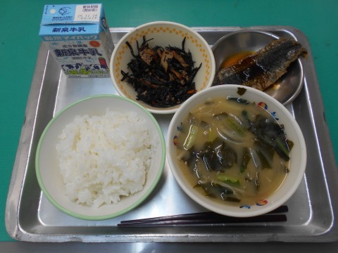 「ぎゅうにゅう,ごはん,みそ汁,ひじきのあま煮,さんまのかばやき風」でした。さんまは青魚と呼ばれる魚の一つです。青魚には、体にいい脂が含まれていて、この脂が血液をサラサラにして、病気の予防につなげてくれます。