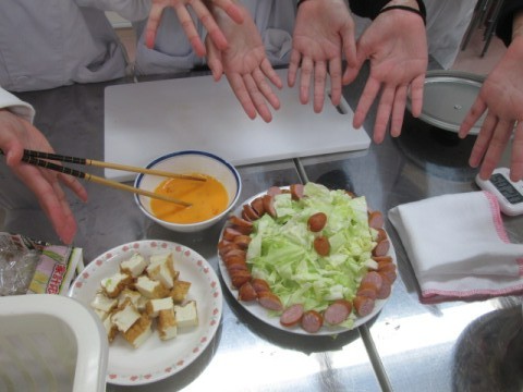 調理実習で「厚あげ豆腐と野菜のチャンプルー」を作っていました。