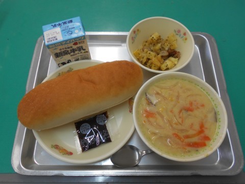 「ぎゅうにゅう,コッペパン,クリーミーコーンの豆乳スープ,ガーリックポテト,チョコレートクリーム」でした。豆乳は、大豆をひと晩水につけてすりつぶし、水を加えて煮詰めたものをしぼった液体の部分です。今日は、スープに使いました。