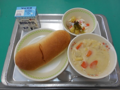 「ぎゅうにゅう,コッペパン,かぶのクリーム煮,コロコロサラダ」でした。冬野菜は,寒さに負けないように自分で「糖」を蓄えます。そのため冬野菜は甘くておいしくなります。今日の大おかずに入っているかぶは冬野菜のひとつです。