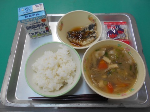 「ぎゅうにゅう,ごはん,ぶた汁,いわしのかば焼き風,福豆」でした。2月3日は節分の日です。節分は豆まきをしたり、いわしや、歳の数だけ福豆を食べたり、恵方巻(太い巻き寿司)を食べる習慣があります。給食には、いわしのかば焼き風と福豆が出ました。