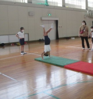 開脚前転や開脚後転、また、倒立前転など、さまざまな技に挑戦していました