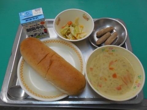 「ぎゅうにゅう,こくとうパン,クマラスープ,野菜ソテー,焼きウインナー」でした。堺市は、ニュージーランドの「ウェリントン市」と姉妹都市です。ニュージーランドの郷土料理の一つにクマラスープがあります。「クマラ」とは、サツマイモに似たニュージーランドの芋のことです。今日はサツマイモでスープを作っています。