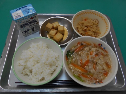 「ぎゅうにゅう,ごはん,切干大根の煮物,ごもくにゅうめん,あつあげのしょうが焼き」でした。切干大根は、細く切った大根を干して乾燥させて作ります。干すことで大根の甘味とうま味が増し、独特の香りと歯ごたえが生まれます。さらにカルシウム、カリウム、食物せんいなど色々な栄養素も、生のものよりも干した方がグンと増えます。