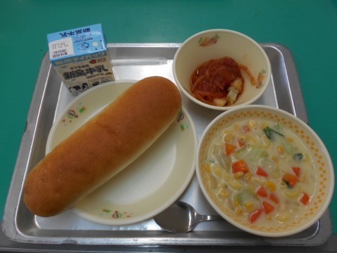 「ぎゅうにゅう,コッペパン,クリーム煮,たらのナポリタン風」でした。たらは大きいものだと20 キログラムほどになるものもあります。鮮度が落ちるのが早く、刺身で食べることができるのは産地でも限られています。今日の給食では、たらを油で揚げ、タレをからめてナポリタン風に仕上げました。