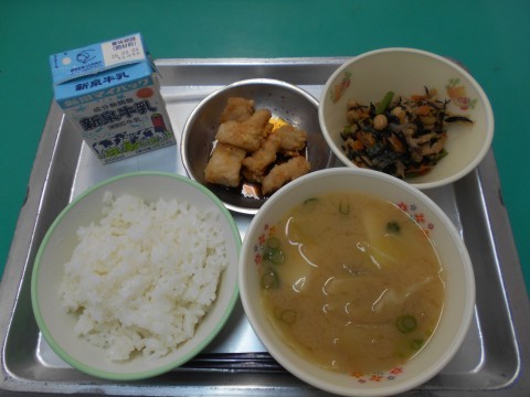「ぎゅうにゅう,ごはん,みそ汁,鉄分たっぷり煮,チキンなんばん」でした。鉄分には体の中に酸素を届ける大切な役割があります。今日の小おかずには鉄分が多く含まれている大豆、小松菜などが入っています。