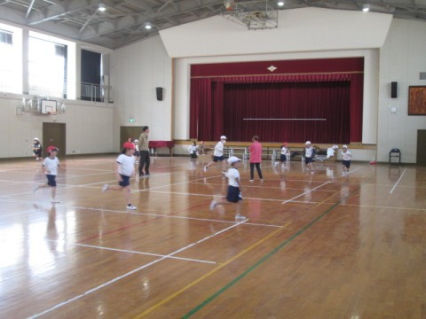 「線鬼ごっこ」「かわり鬼」など、さまざまな鬼あそびを通して体いっぱいに運動を楽しんでいました。