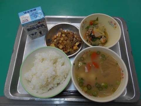 「ぎゅうにゅう,ごはん,いなかだんご汁,はくさいとしろなの煮びたし,豆かりんとう」でした。豆つまみ大会では,とてもじょうずにおはしを使っている人がいました。今日は「豆かりんとう」がメニューにありました。豆をうまくつまめるよう意識しながら食べている様子が見られました。