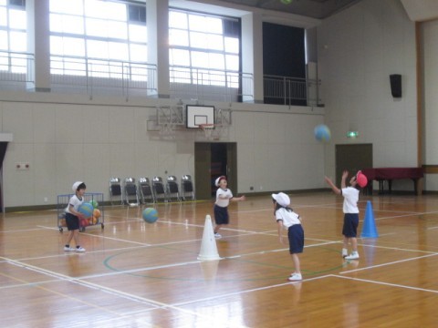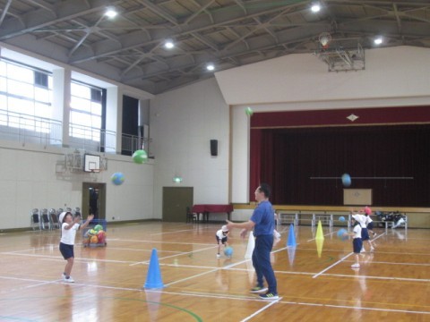 同時に投げたボールを互いにキャッチできるか、ペアで挑戦していました。