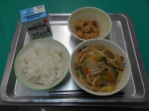 「ぎゅうにゅう,ごはん,すき焼きうどん,高野どうふのからあげ」でした。高野どうふはとうふを一度凍らせてから乾燥させたものです。水で戻したあと、だし汁で煮て味をしみこませて、食べることが多いです。今日の給食では片栗粉をまぶして油で揚げています。