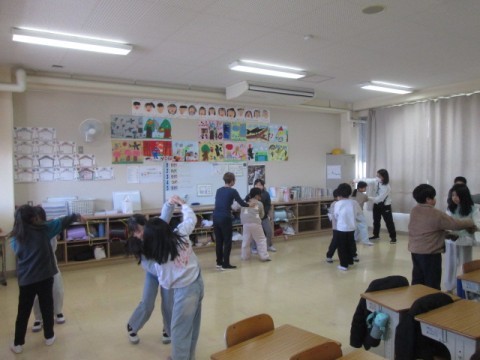3月5日(木)2年 音楽 公開日 2026/03/06 更新日 2026/03/05 2年生 「わらべうた」の学習を行っていました。「あんたがたどこさ」や「なべなべそこぬけ」など、さまざまな「わらべうた」をみんなで楽しんでいました。