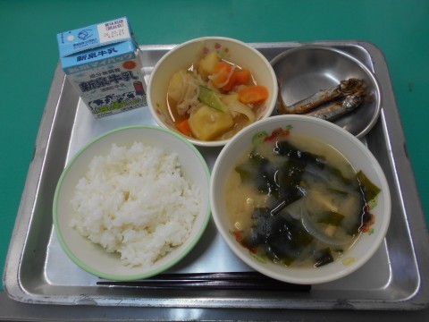 「ぎゅうにゅう,ごはん,にくじゃが,みそ汁,やきししゃも」でした。きぬさやは、春から初夏にかけて旬を迎える緑黄色野菜です。また、さやえんどうとも言い、えんどう豆が大きくなる前に採ったものを食べています。