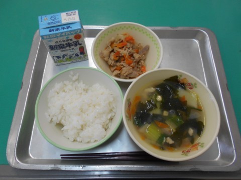 「ぎゅうにゅう,ごはん,トックとわかめのスープ,ぶたにくのプルコギ」でした。「トック」は韓国のおもちです。日本のもちは、もち米から作られるのが一般的ですが、韓国のもちは、うるち米から作られています。「トッ」が、もちを意味し、「ク」は、「汁物」という意味だそうです。