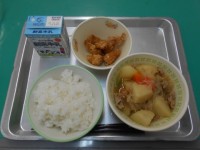 献立は、コーンポタージュと鶏肉の香草焼き、おさつパン、フルーツゼリー、牛乳です。