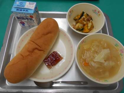 「ぎゅうにゅう,コッペパン,ミックスジャム,かぼちゃのチーズやき,やさいスープ」でした。かぼちゃは「カンボジア」から日本に伝わったため「かぼちゃ」と呼ばれるようになったそうです。