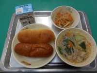 「ぎゅうにゅう,こくとうパン,クマラスープ,野菜ソテー,焼きウインナー」でした。...