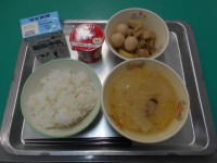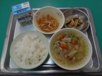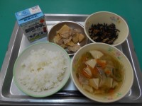 「ぎゅうにゅう,ごはん,どんがら汁,とりにくのさっぱり煮,フルーツゼリー」でした...