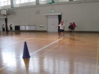 フリスビーを使った運動を行っていました。コーンに狙いを定めて一生懸命投げていまし...