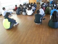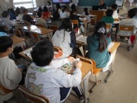 3年3組は音楽室で、いつもとは違う座り方で何か書き込んでいます。見ると、曲を聞い...