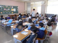 「ひらがな」の学習です。プリントに一画一画、丁寧に書いています。
