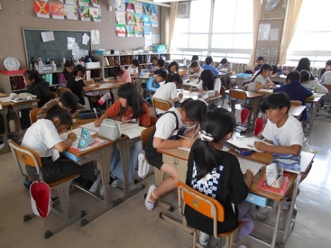 国語では、班になって、友だちと「伝え合う」学習をしています。