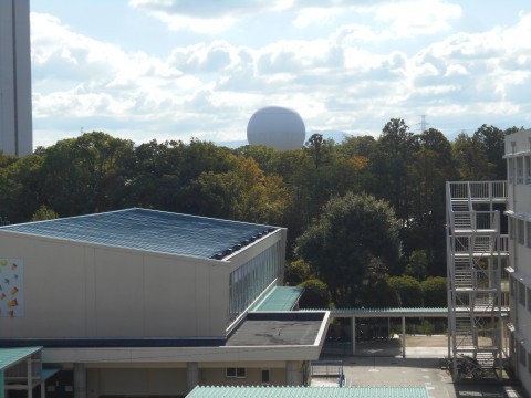 4階から大仙公園の方を見ると、何やらまぁるい頭がのぞいています。