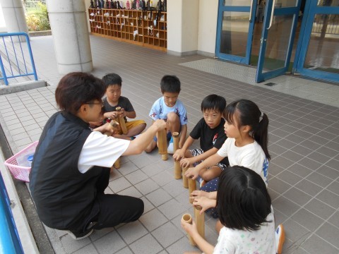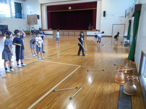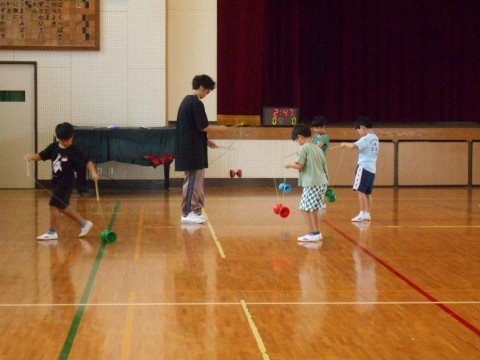 体育館の奥の方では、担任の先生も中国コマに夢中でした!