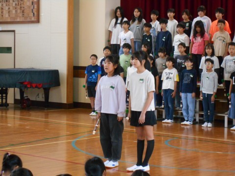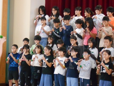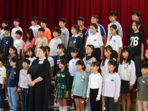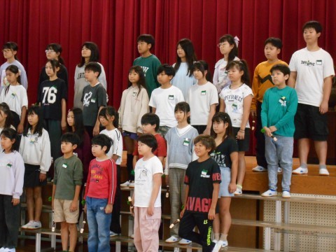 今日の朝礼は、来週火曜日に本番を迎える5年生の連合音楽会、校内発表がありました。