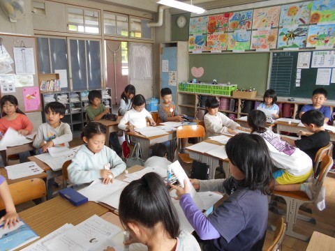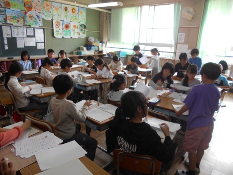 3年2組は道徳で学習したプリントをノートに貼っていました。