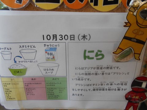 きょうの給食には「にら」が入っています。「にら」には,疲労回復を助ける働きがありますよ!