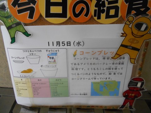 コーンブレッドは,堺市と姉妹都市提携を結んでいる,アメリカのバークレー市の家庭料理です。とうもろこしの粉を使って作るパンのようなものですが,給食ではコーンクリームで作っています。